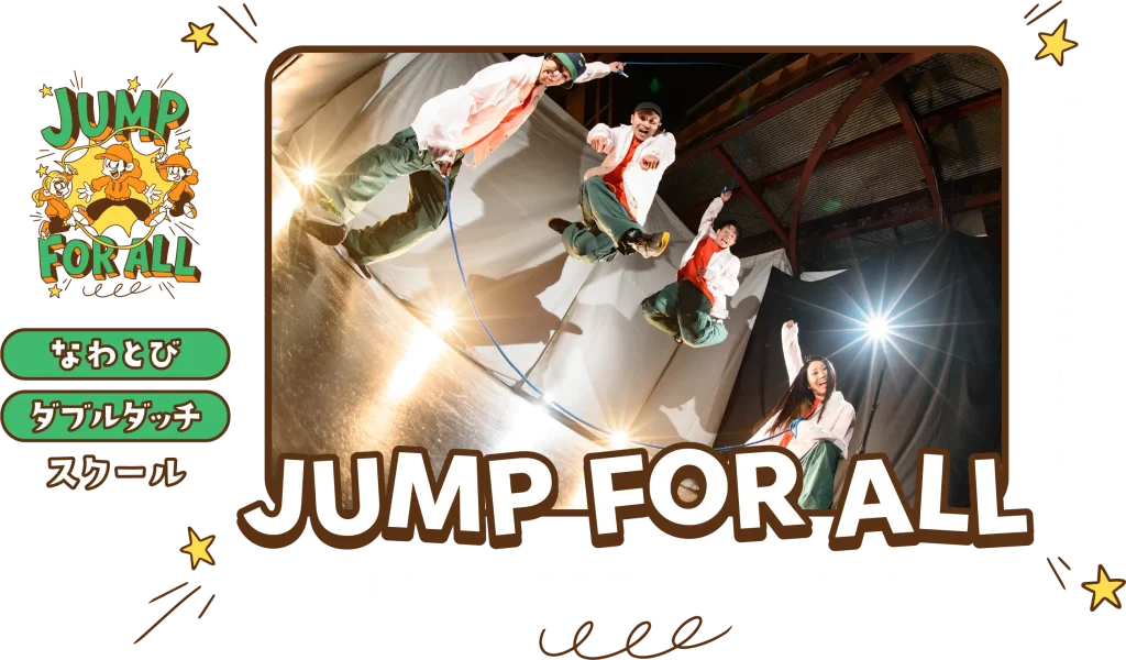 取材映像(朝日新聞様)/出演:講師 龍太郎 JUMP FOR ALLのカリキュラムの詳細はこちらから! なわとび、ダブルダッチを通して、 基礎体力や身体の使い方といった「体の成長」と、 表現力や協調性、コミュニケーション能力といった 「心の成長」をサポートします。 カリキュラムを見る 取材映像(朝日新聞様)/出演:講師 龍太郎 なわとび、ダブルダッチを通して、基礎体力や身体の使い方 といった「体の成長」と、表現力や協調性、 コミュニケーション能力といった「心の成長」をサポートします。 JUMP FOR ALLのカリキュラムの詳細はこちらから! カリキュラムを見る JUMP FOR ALLの なわとび・ダブルダッチスクールは、 北海道内の各地で開催しています。 お近くの開催地は こちらからお探しください! 教室一覧を見る 龍太郎 先生 RYO 先生 Seiko 先生 かんた 先生 講師紹介を見る 講師紹介を見る 最新の活動情報は、インスタグラムにて発信しています! お知らせはもちろん、スクール風景や発表の動画など、 ぜひチェックしてください! 褒めて伸ばしてくれるのでやる気が出ます! Yちゃん 3年生女の子 ダブルダッチが楽しすぎて、一緒にやるお友達がいなくても、他の習い事辞めても、ダブルダッチだけはやりたい!と本人の強い意志があり始めました。 褒めて伸ばしてくれるので、本人もやる気がでるようです。毎週レッスンをとても楽しみにしています。学校の先生には縄跳び名人と呼ばれています。 堂々と演技することができるようになりました! Nちゃん 4年生女の子 保育園の先生がダブルダッチをしていて、保育活動にも取り入れてくれていたため、ダブルダッチの楽しさとその先生に憧れて入会しました。 遊びに来ているんじゃないかと思うくらい楽しそうだけど、ちゃんと実力もついているので不思議です。楽しみがら学べるところがとても良いと思います。 最近では自分に自信が持てるようになり、みんなが観ているステージで堂々と演技する事が出来るようになりました。 物事を客観的に分析する力や協調性が身につきました。 Yくん 中学生 男の子 学童のプログラムの中でダブルダッチを体験し、毎回楽しみにしていました。習い事としてできるようになった時は迷わず即入会しました! 大会前などは普段の和気あいあいな中にもチームで力を合わせながらパフォーマンスを完成させていく真剣さも垣間見え、とてもいい雰囲気で練習しているように思います! 初めのうちはただ楽しくて通っていましたが、大会に出たり、仲間とパフォーマンスを作り上げて行く中で、物事を客観的に分析する力や協調性が身についたと感じます。 なわとびが跳べないのですが大丈夫ですか? 大丈夫です。得意な子ばかりが集まるクラブではありません。一から丁寧に指導するので安心してください。 成果発表の場はあります? 年間通してイベント大会等が3回あります。 カリキュラムはどのような形ですか? 年間を通してテーマを決めてレッスンを行っています。 (例) 4〜6月個人のスキルを伸ばすレッスン7〜10月チームパフォーマンス11月〜3月基礎力レッスン 他の習い事と掛け持ちできますか? できます。運動能力向上を目的にしていますので、掛け持ちも大歓迎です。他のスポーツでの活躍も応援する形でレッスンを行っています。 他なわとびをやったらどんないいことがありますか? 体力向上、リズム感がつく、チャレンジ精神の向上等、様々な効果があります。